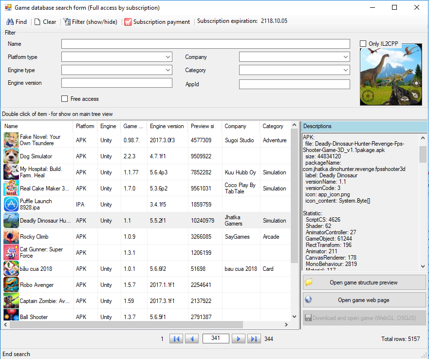 Annual access to Game database.Game database is available to connect to licenses Unpacker, RePacker, MagicStudio, GameRecoveryIt allows you to search for games according to the type of game used by the game engine as well as preview the contents of the game (resource tree)